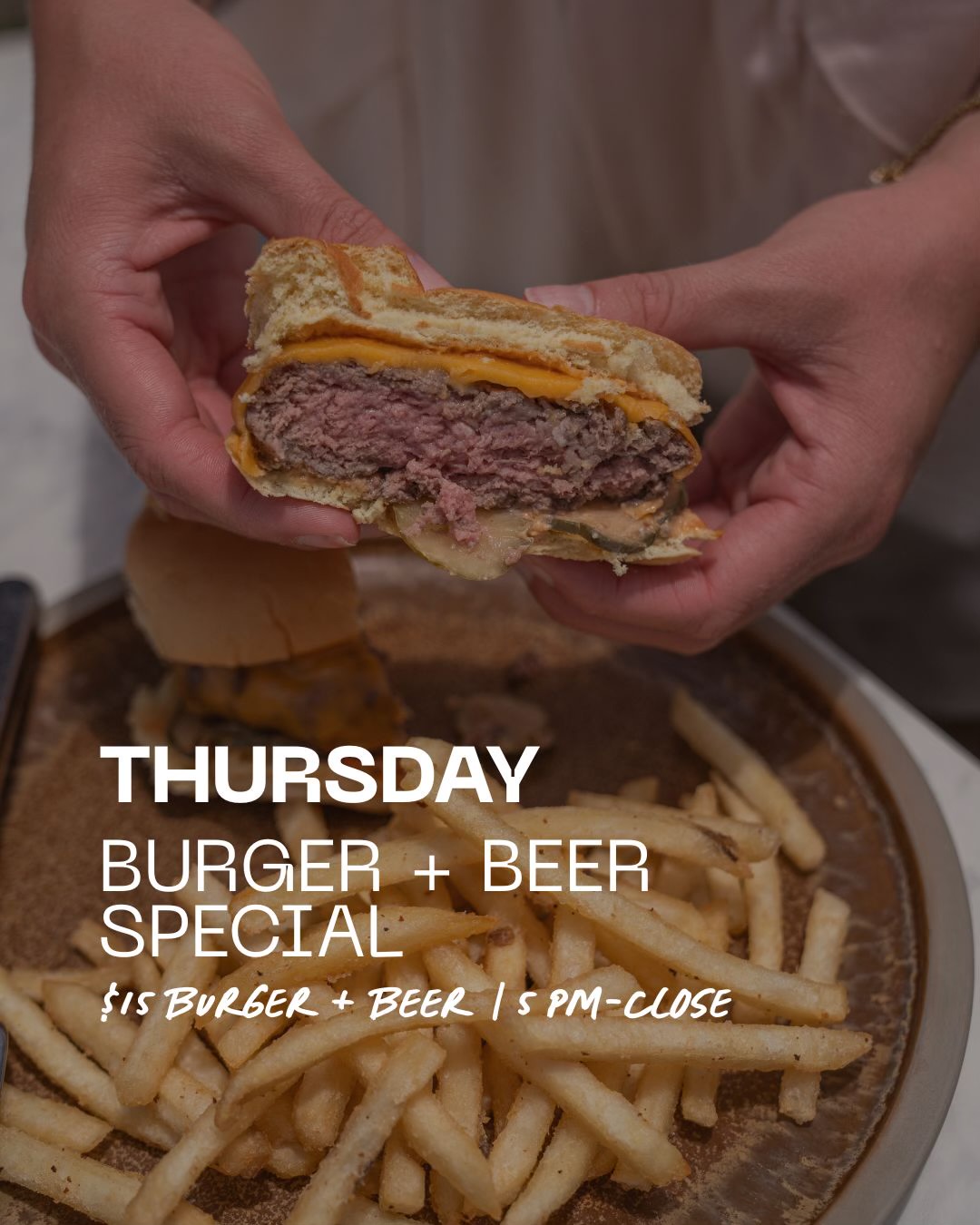 Every Thursday. Beer + Burger combo just $15